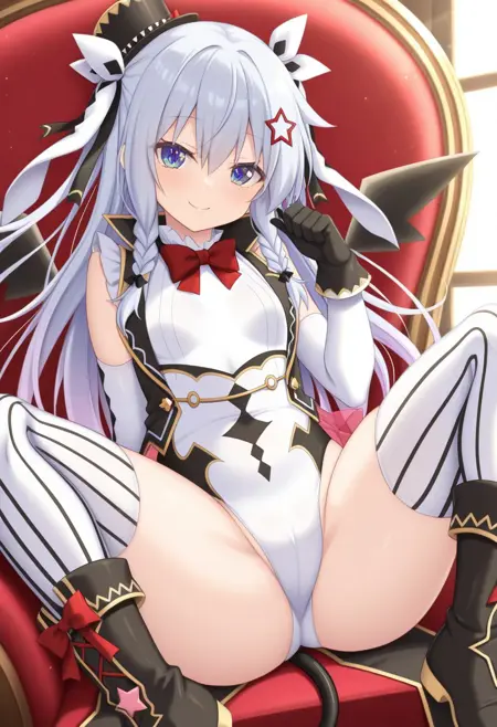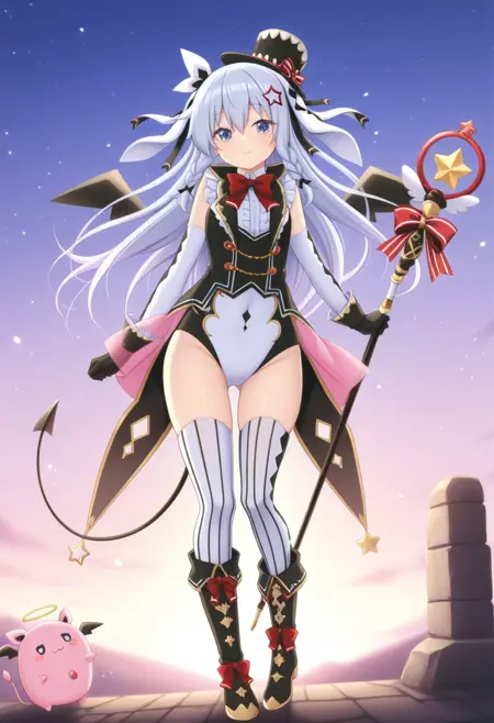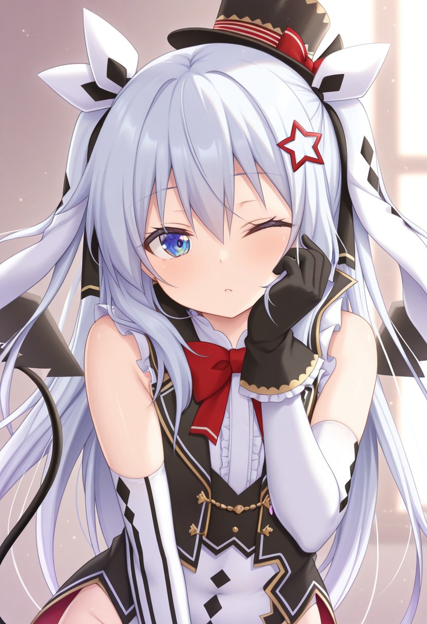 1 girl, SonyaSankai, 흰 머리, 긴 머리, 옆머리 땋기, 쌍둥이 땋기, 파란 눈, 눈에 별, 별 모양 머리 장식, 머리 리본, 작은 날개, 악마 꼬리, 탑햇, sonyasankai 모자, 빨간 리본 넥타이, 소매 없음, sonyasankai 테일코트, 테일코트,