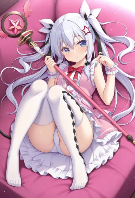 1 girl, SonyaSankai, 흰 머리, 긴 머리, 트윈테일, 파란 눈, 눈에 별, 별 모양 머리 장식, 머리 리본,
