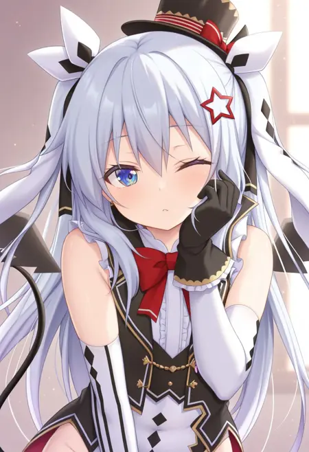 1 girl, SonyaSankai, white hair, long hair, side braid, twin braids, blue eyes, star in eye, star hair ornament, hair ribbon, mini wings, demon tail,top hat, sonyasankai hat, Red bowtie, sleeveless, sonyasankai tailcoat, tailcoat,