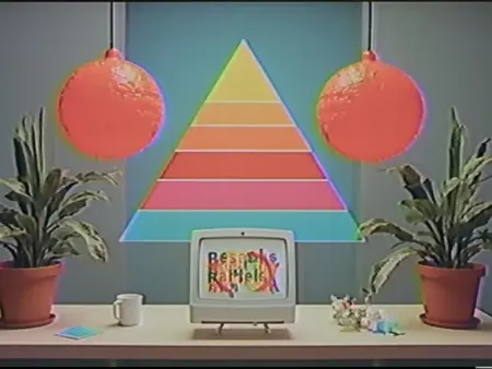 시각적 분위기: 흐릿한 아날로그 톤, 두꺼운 CRT 스캔라인, 미니멀리즘 세트 디자인, 천진난만한 제품 포즈, 부드러운 조명, 억제된 색조