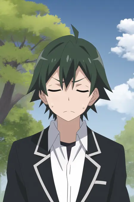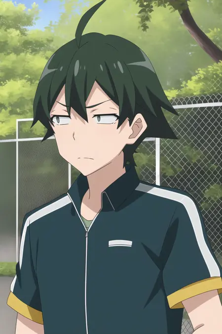 第1季S1:hikigaya hachiman s1, 1boy, green hair, black eyes, sanpaku, ahoge,