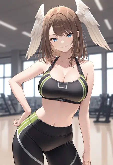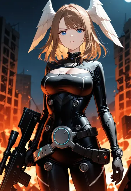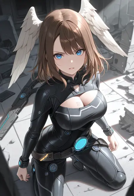 "EUNXC3, head wings, blue eyes, medium hair, brown hair, bodysuit, cleavage cutout, belt, long sleeves"