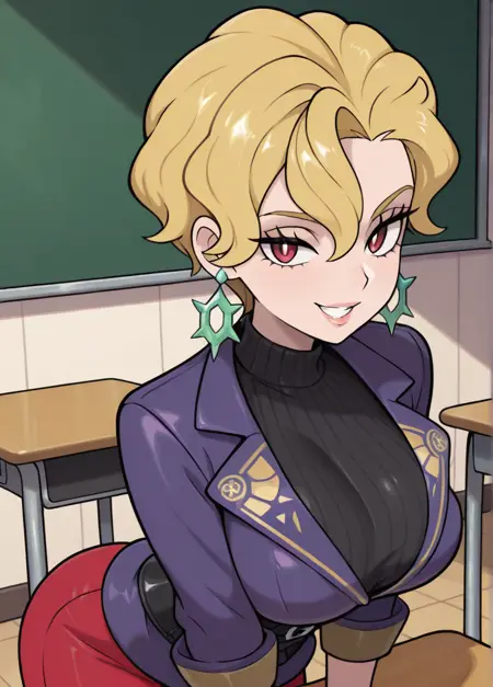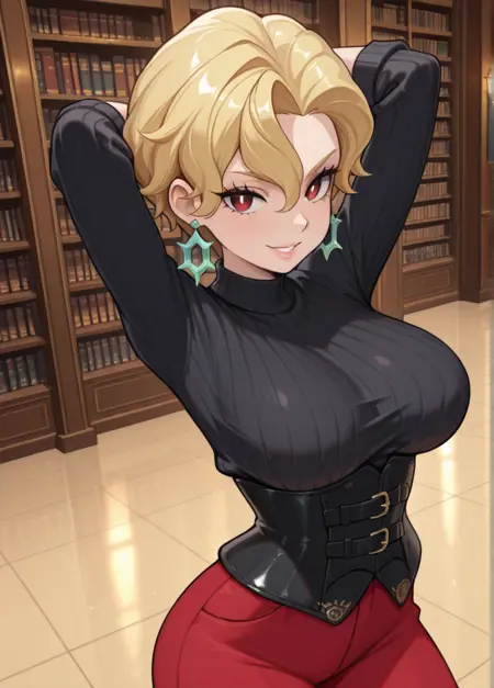 breasts, jacket, red pants, purple jacket, turtleneck sweater, black sweater, ribbed sweater, corset,