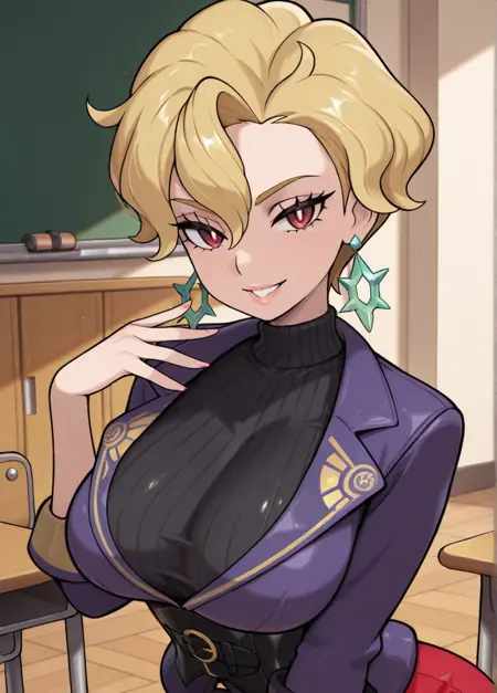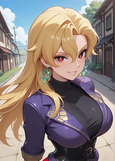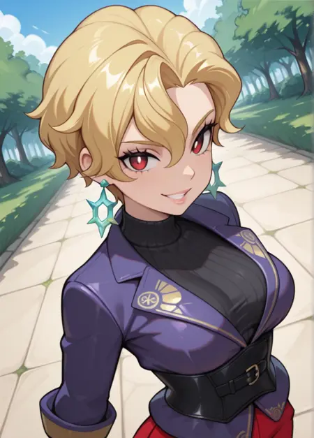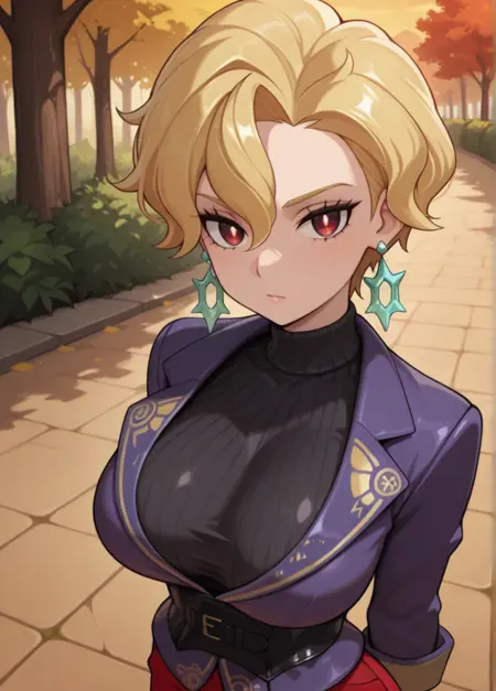 briarxd, 1girl, earrings, jewelry, blonde hair, red eyes, short hair, hair between eyes,