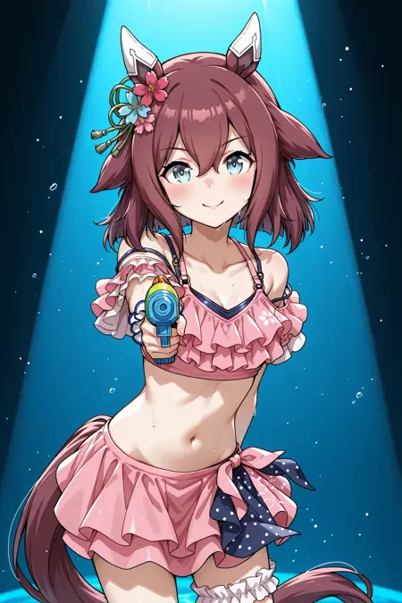 공식 대체 복장, 수영복, 배꼽, 어깨 노출, 어깨 드레스, 관자놀이, 분홍 비키니, 프릴, 가슴 노출, 어깨 드레스 비키니, 물총 잡기, 프릴 비키니, 웨딩 가터, 손목 스러치,