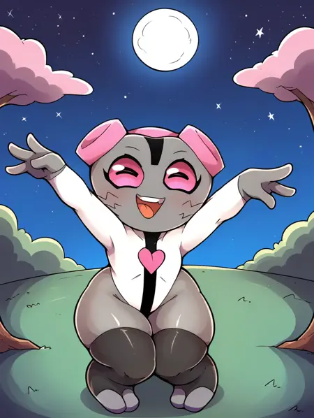 white one piece outfit, pink heart symbol on the suit, black toeless stockings,