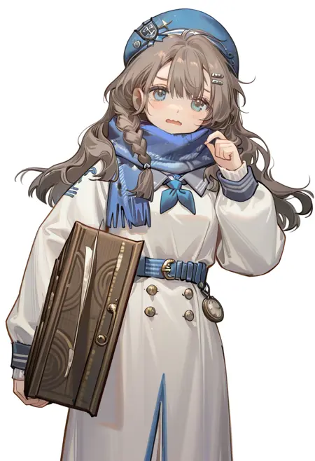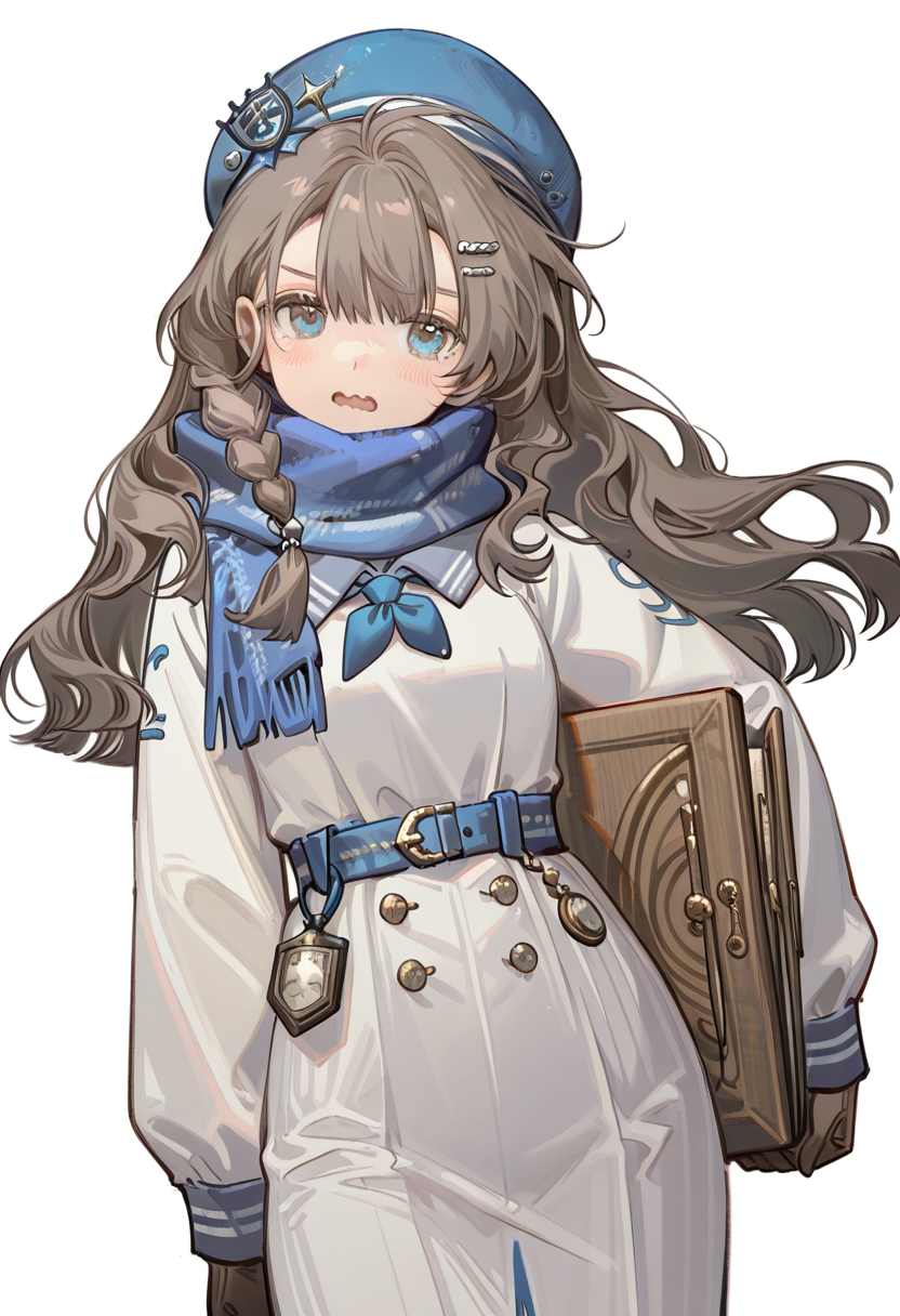 marcus \(a returning wind\) \(reverse:1999\),blue eyes,brown hair,braid,blue scarf,holding box,white dress,long sleeves,blue beret,lora:reverse\_1999\_marcus\_5\_in\_1-000021:0.9,