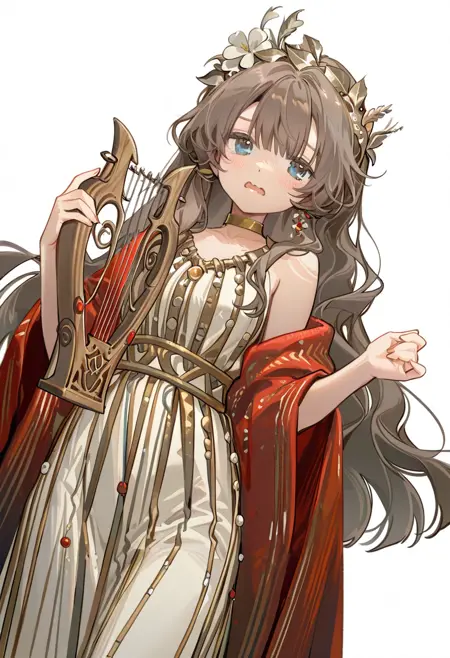 marcus \(to the gates of the underworld\) \(reverse:1999\),blue eyes,brown hair,toga,greco-roman clothes,gold choker,laurel crown,necklace,red sleeves,holding harp,red sleeves,hair flower,gold trim,harp,long dress,lora:reverse\_1999\_marcus\_5\_in\_1-000021:0.9,