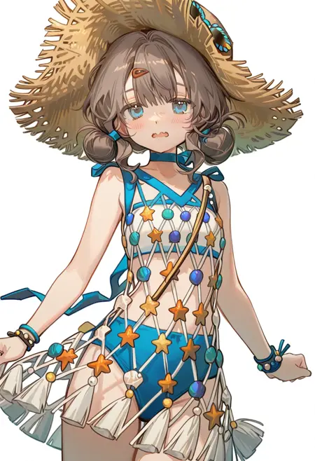 marcus \(on the white sand\) \(reverse:1999\),blue eyes,blush,brown hair,short hair,seashell,dress,swimsuit,straw hat,basket,lora:reverse\_1999\_marcus\_5\_in\_1-000021:0.9,