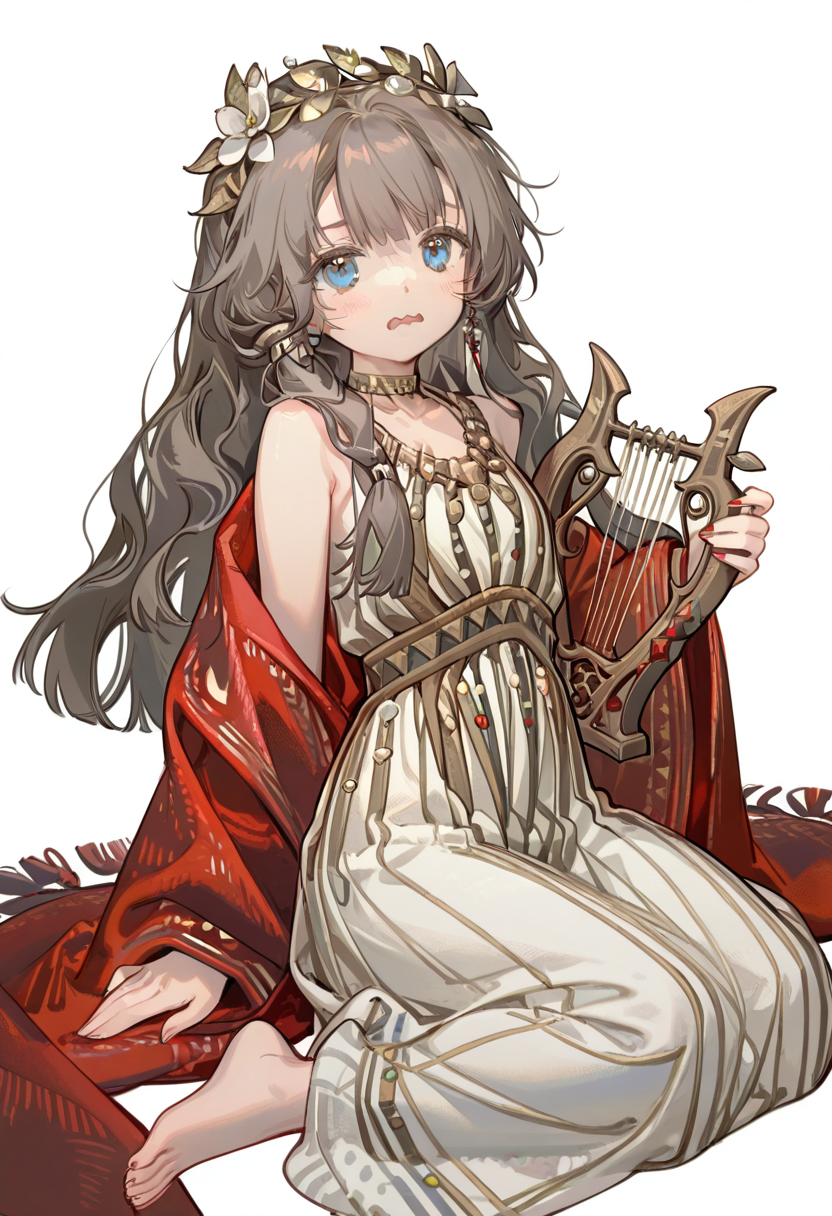 马库斯 \(to the gates of the underworld\) \(reverse:1999\),蓝眼睛,棕发,托加袍,古希腊-罗马服饰,金色项圈,桂冠,项链,红色长袖,手持竖琴,红色袖口,发饰花,金色镶边,竖琴,长裙,lora:reverse_1999_marcus_5_in_1-000021:0.9,