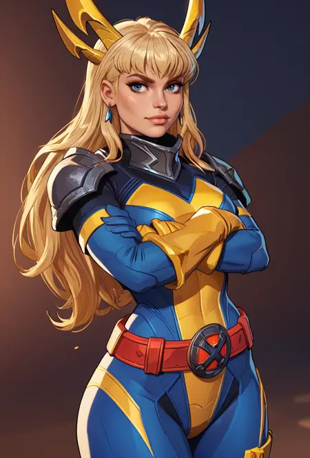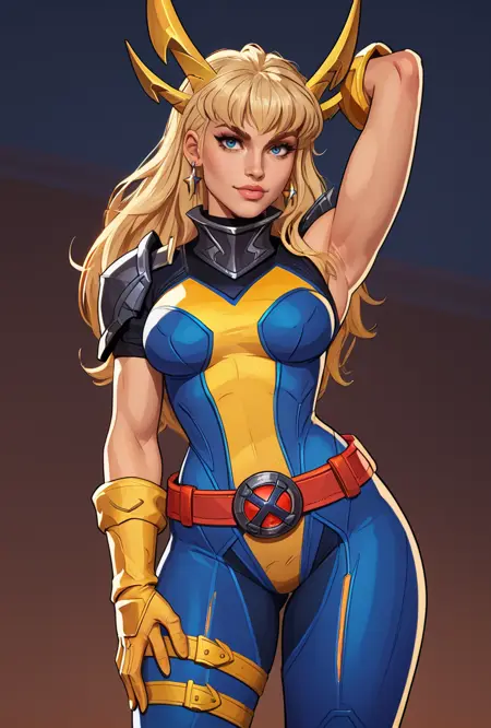 magik_retro_x, blonde hair, long hair, blue eyes, horns, bodysuit, armor, belt, gloves