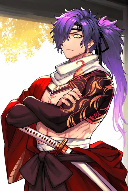第三阶段服装: 一缕头发遮住一只眼睛,马尾辫,长发,紫色头发,黄眼睛,胡茬,日本服装,腹部缠布,头带,外褂,和服,围巾, katana,0kada iz0 outfit 2