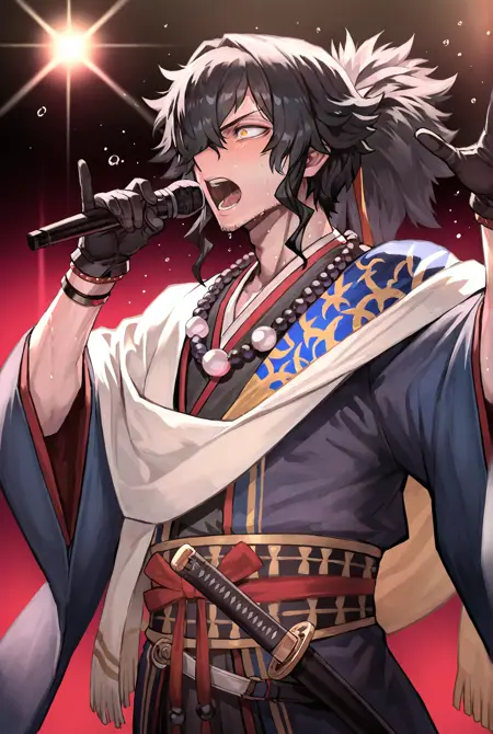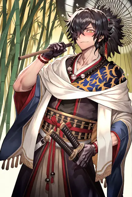 服装2服装: 一缕头发遮住一只眼睛,马尾辫,长发,黑发,黄眼睛,珠宝,手套,日本服装,珠子,项链,和服,手镯,珠链,围巾,长袖,胡茬,腰带,宽袖, katana,0kada iz0 outfit 4