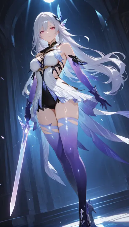 장갑, 드레스, 보석, 어깨 노출, 허벅지, 분리형 소매, 팔꿈치 장갑, 흰색 드레스, 표정 없음, 두꺼운 허벅지, 보라색 장갑, 그라데이션 다리 착용, 허벅지 길이 양말, 가슴 사이 공간, 검은 레오파드, 배꼽 가림, 허벅지 사이로 보이는 엉덩이, 허벅지 틈, 보라색 허벅지 양말, 파란색 허벅지 양말, 파란색 소매, 반바지, 짧은 반바지, 검은 반바지, 그라데이션 옷, 옷 절단부,전신 + 무기 + 날개