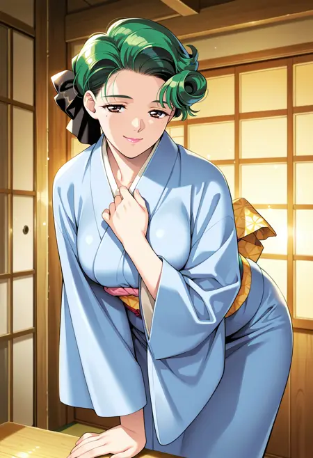 基础:n_sachiko, 1girl, 复古艺术风格, 单人, 短发, 绿发, 发髻, 卷发, 发带, 眼下痣, 棕色眼睛, 半闭眼, 口红, sachiko蓝色和服, 日本服饰, 腰带, 袖带, 长袖, 宽袖, 大胸部,