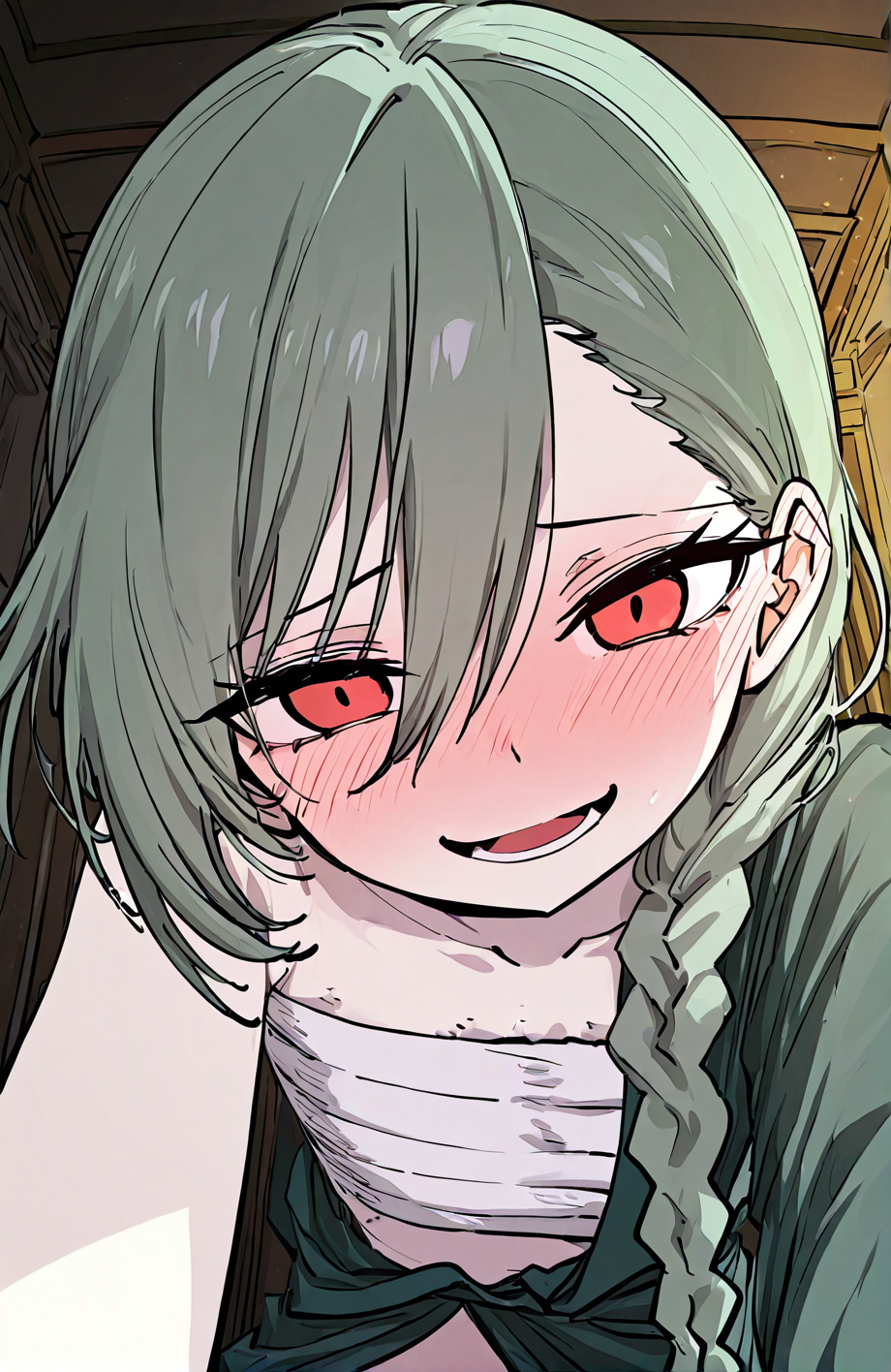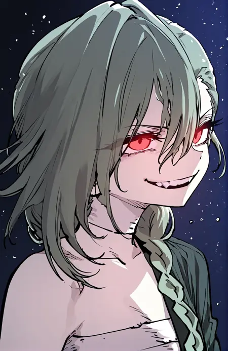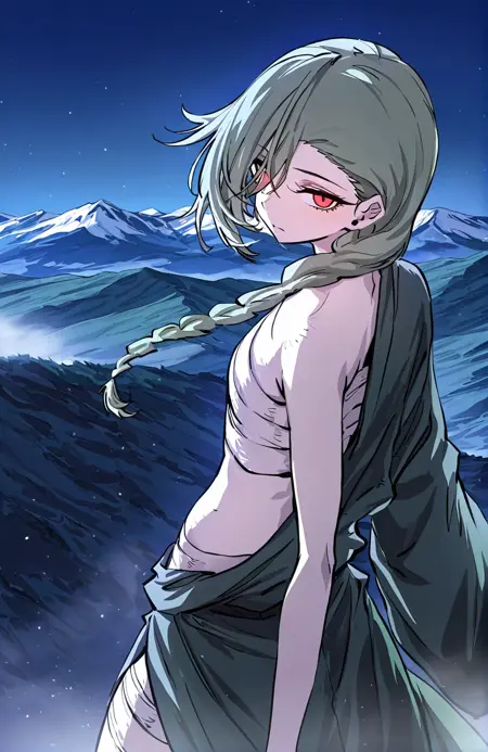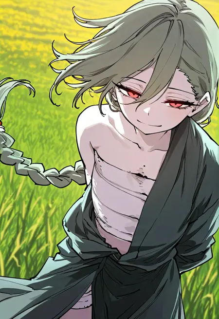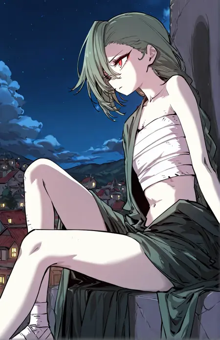 | 训练词汇 | 1 girl, pale skin, red eyes, short hair, green hair, side braid, long side braid, hair over one eye,已复制! tattered robe, asymmetrical robe, open front robe, dark green robe, jagged edges, high slit robe, bandage chest wrap, bandages on legs, bandaged feet, asymmetrical outfit,已复制! |