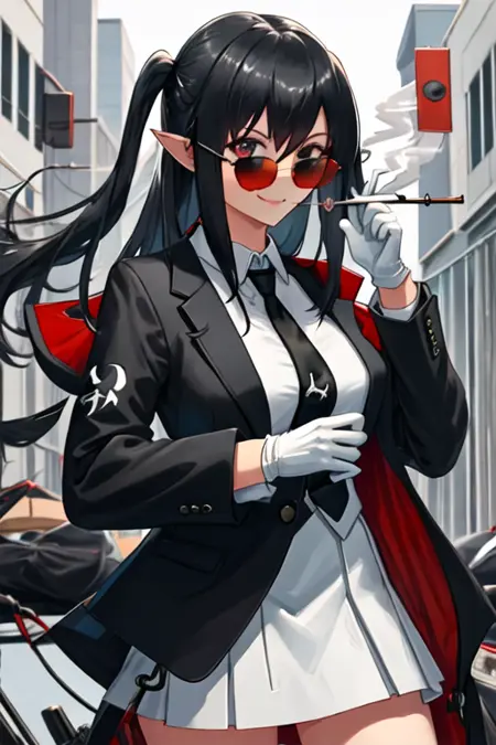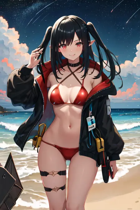 触发词为closure_arknights,推荐标签为:best quality, masterpiece, highres, solo, {closure_arknights:1.15}, black_hair, pointy_ears, long_hair, red_eyes, bangs, hair_between_eyes, smile, upper_body, breasts, blush, two_side_up。