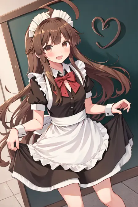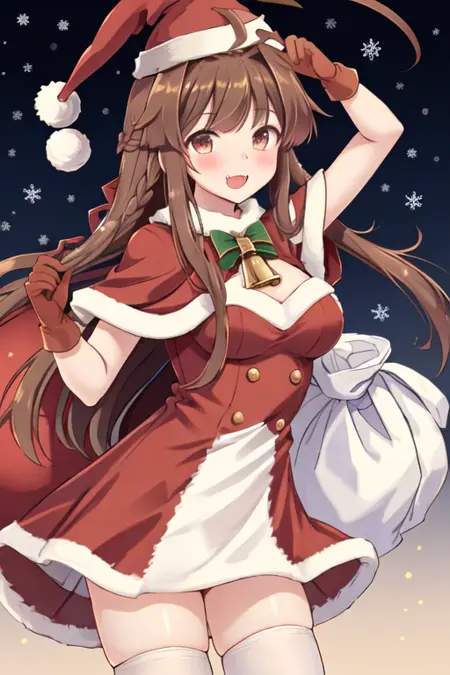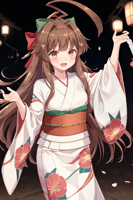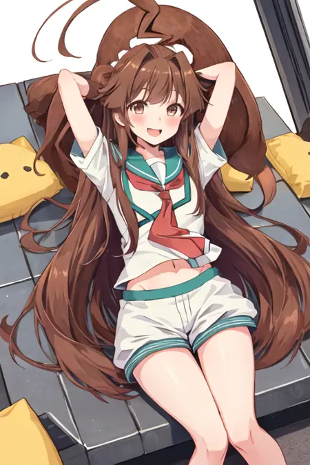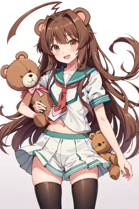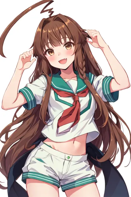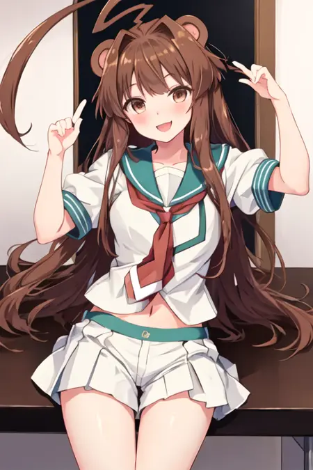 トリガーワードはkuma_kantaicollection、お薦めのタグはbest quality, masterpiece, highres, solo, {kuma_kantaicollection:1.15}, brown_hair, long_hair, ahoge, brown_eyes, huge_ahoge, blush, smile, open_mouth, serafukuです。