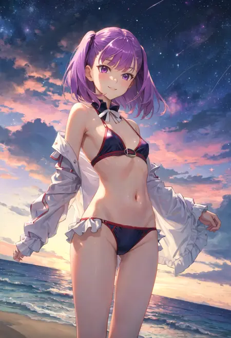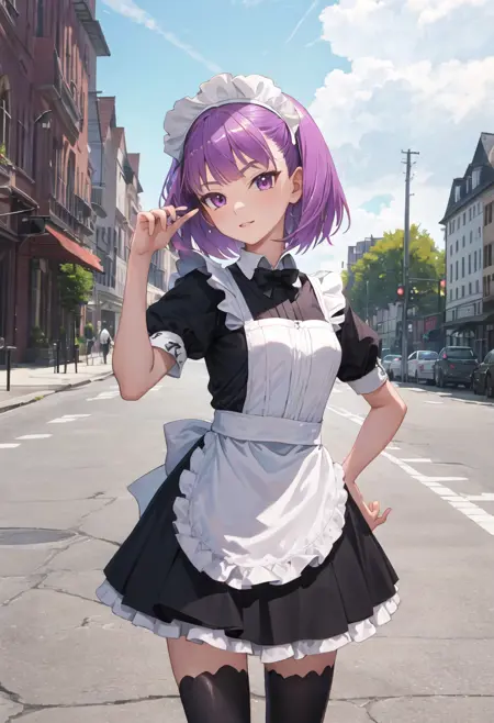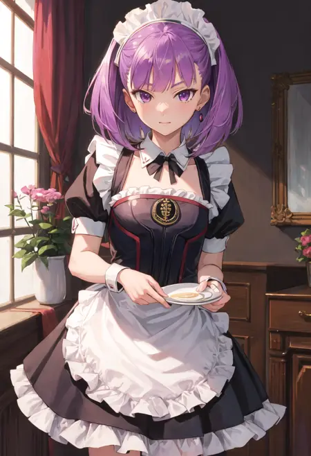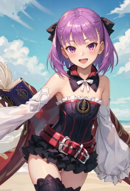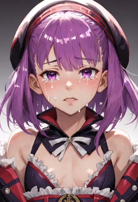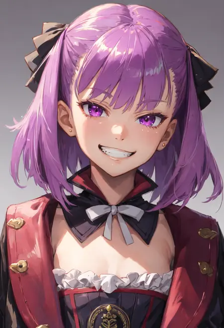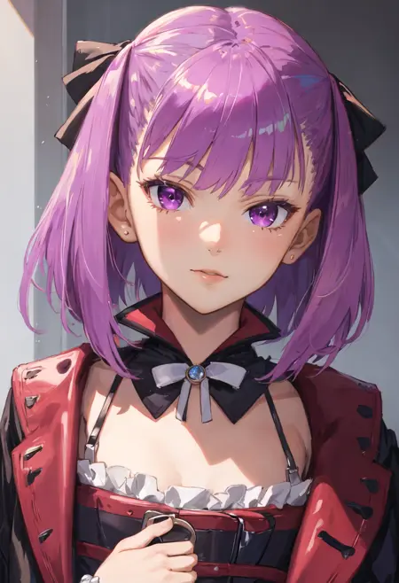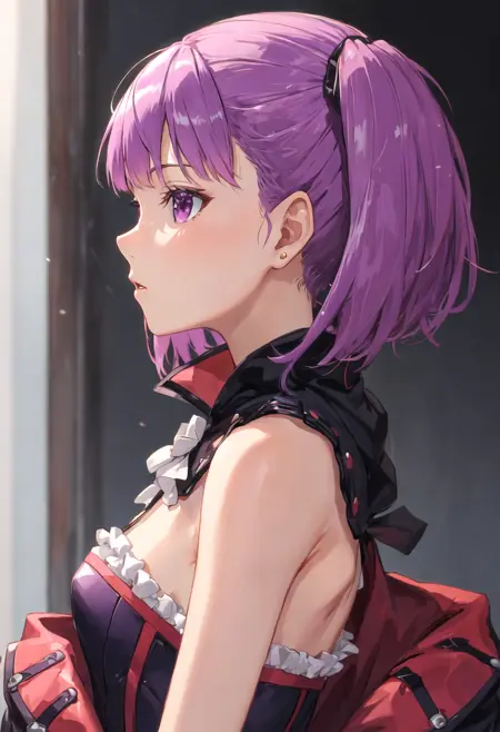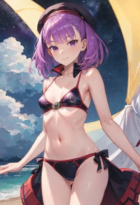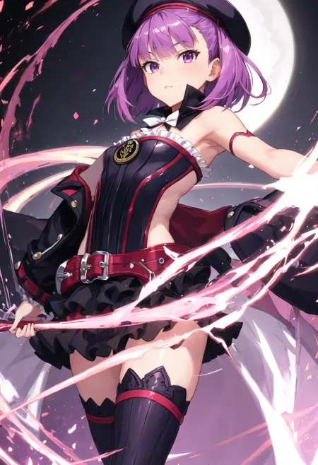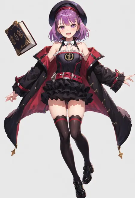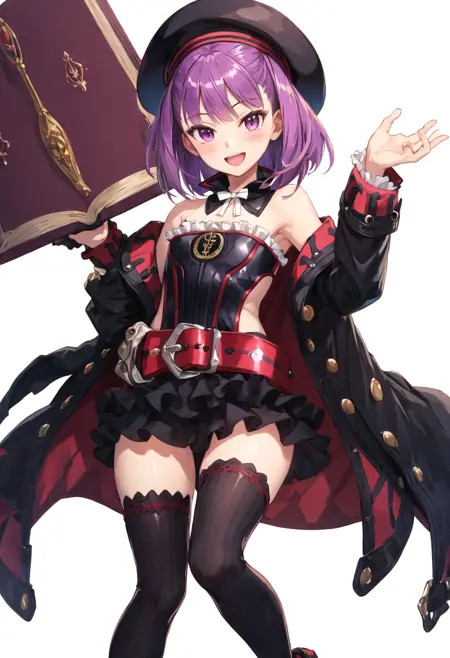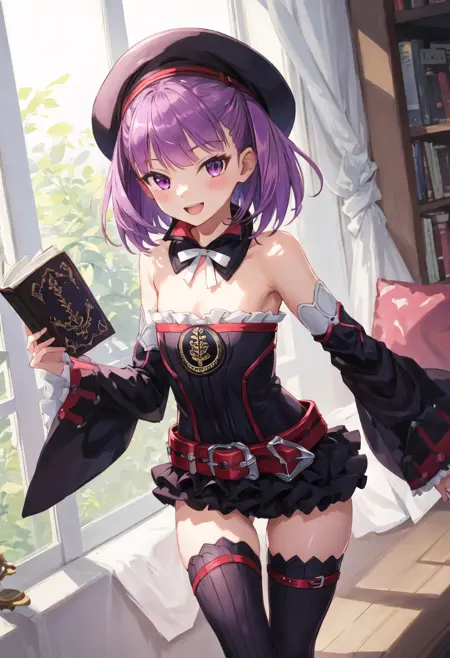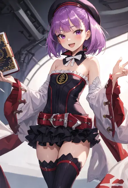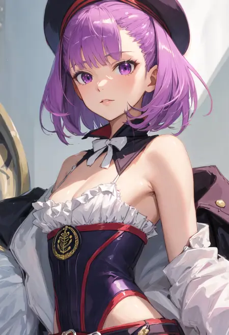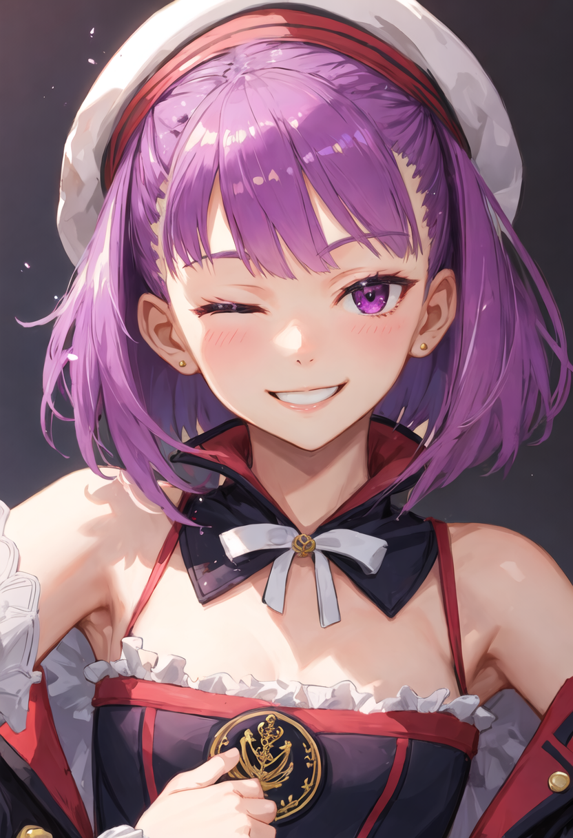 - 축소된 캐릭터 태그는 purple_hair, purple_eyes, short_hair, bangs, breasts, small_breasts, hat입니다. 캐릭터의 핵심 특징(예: 머리색)이 안정적이지 않을 때 이 태그를 프롬프트에 추가할 수 있습니다.