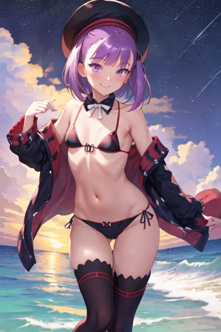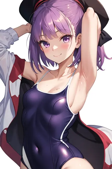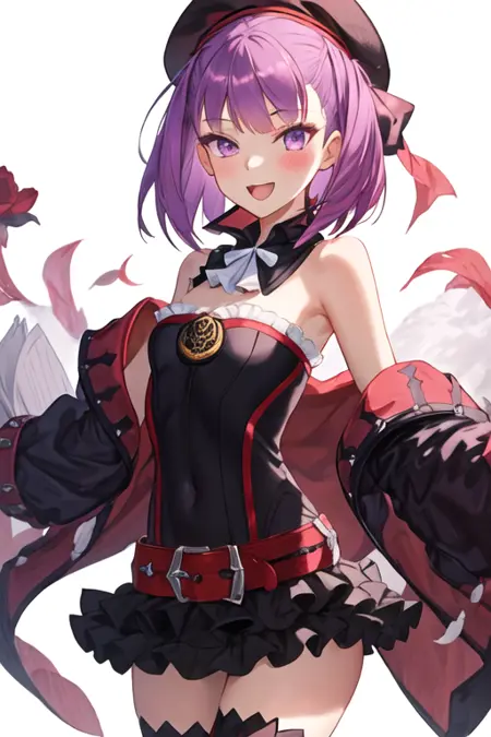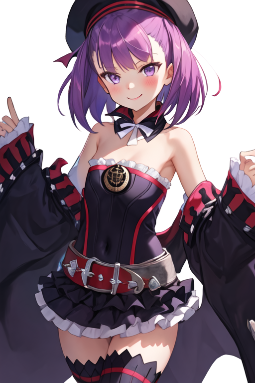 - The pruned character tags are purple_hair, purple_eyes, short_hair, bangs, breasts, small_breasts, hat. You can add them into prompts when core features (e.g. hair color) of character is not so stable.