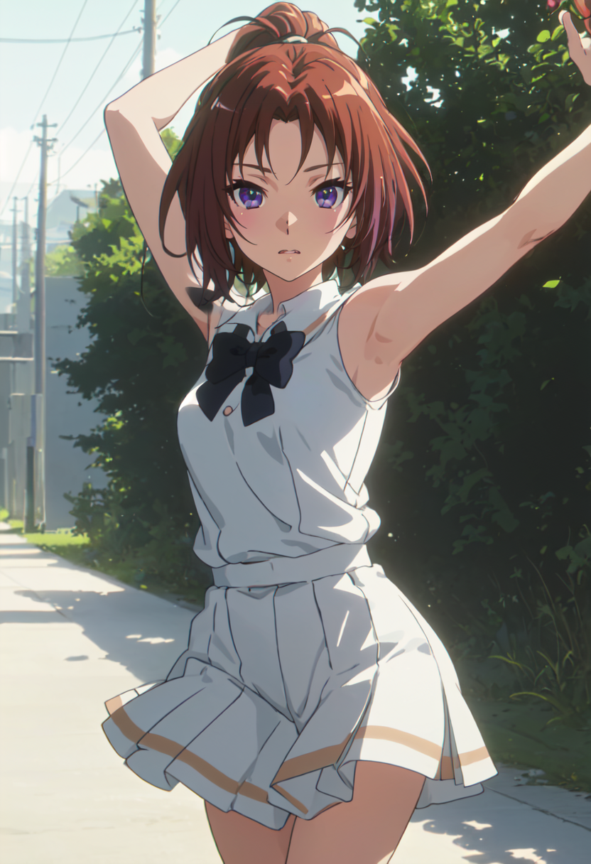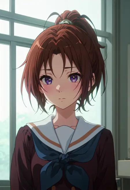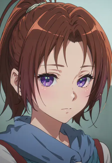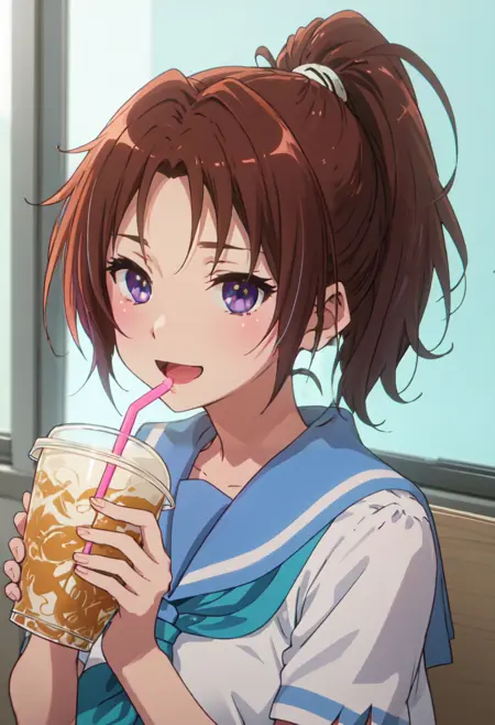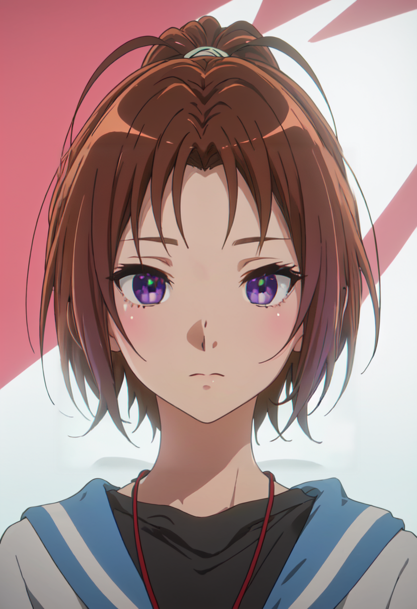 - 축소된 캐릭터 태그는 갈색 머리, 포니테일, 긴 머리, 보라색 눈입니다. 캐릭터의 핵심 특징(예: 머리색)이 안정적이지 않을 때 이 태그를 프롬프트에 추가할 수 있습니다.