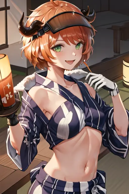 触发词为 croissant_arknights,推荐标签为:best quality, masterpiece, highres, solo, {croissant_arknights:1.15}, horns, orange_hair, green_eyes, bangs, smile, ahoge, long_hair, open_mouth, upper_body, breasts, visor_cap, midriff, cow_horns, short_hair。
