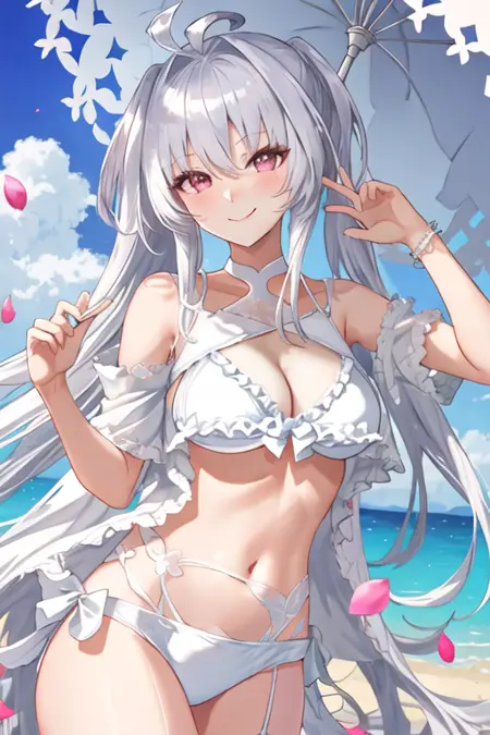触发词为 lady_avalon_fgo,推荐标签为:best quality, masterpiece, highres, solo, {lady_avalon_fgo:1.15}, long_hair, white_hair, bangs, ahoge, breasts, smile, very_long_hair, swimsuit, white_bikini, purple_eyes, medium_breasts, frilled_bikini, cleavage, umbrella, parasol, navel, red_eyes。
