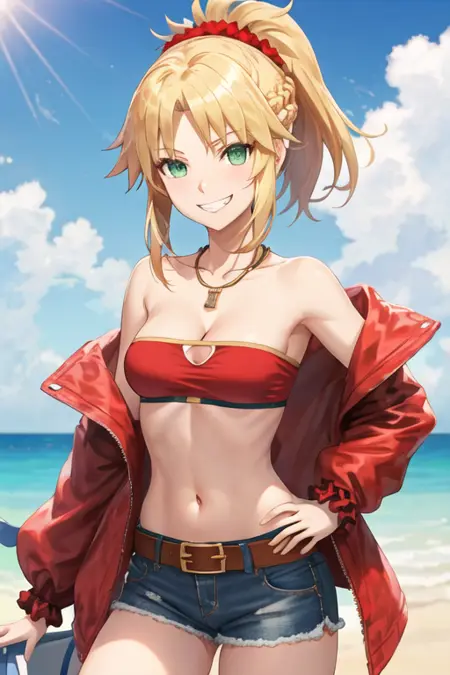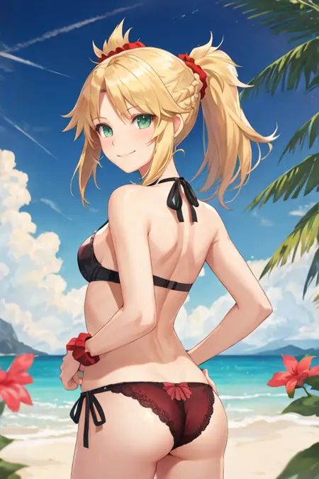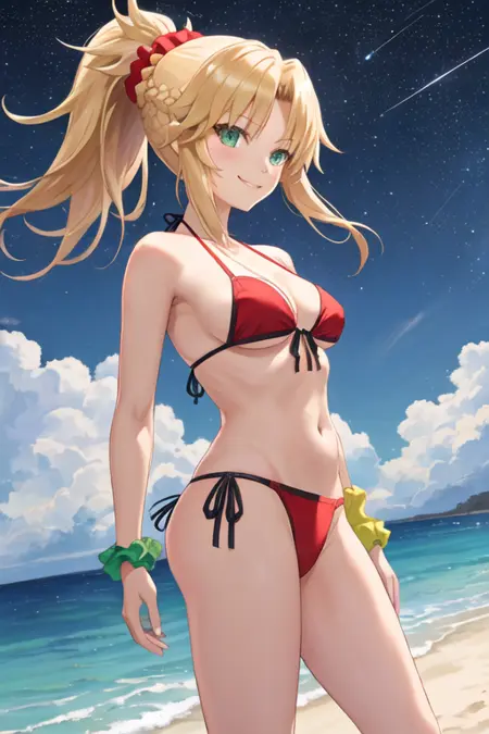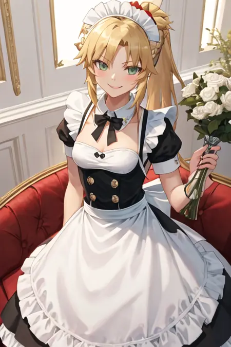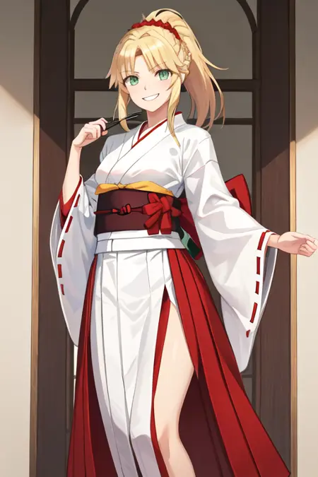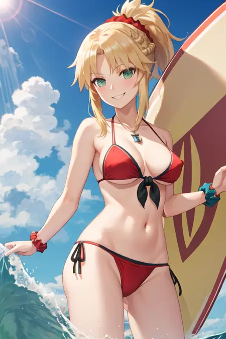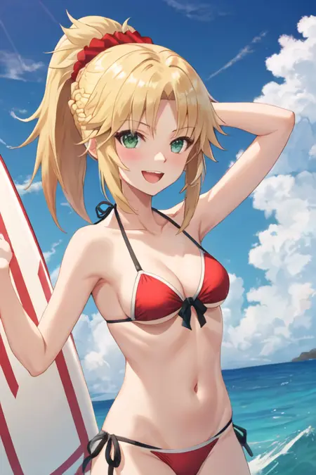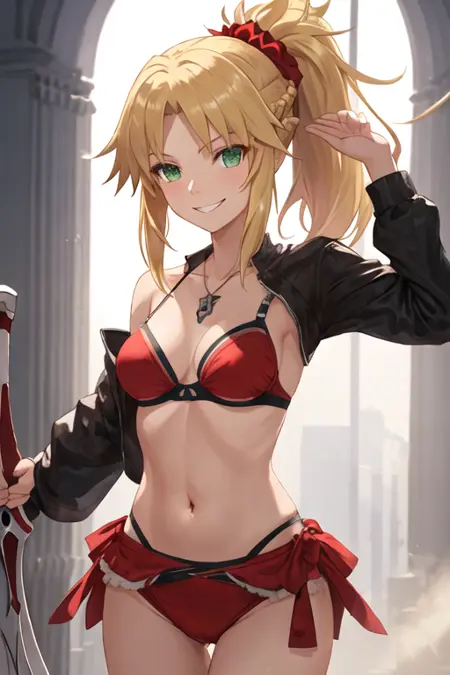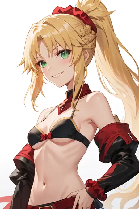 트리거 단어는 mordred_fgo이며, 권장 태그는 best quality, masterpiece, highres, solo, {mordred_fgo:1.15}, blonde_hair, long_hair, ponytail, green_eyes, braid, scrunchie, hair_ornament, red_scrunchie, bangs, hair_scrunchie, breasts, smile, small_breasts입니다.