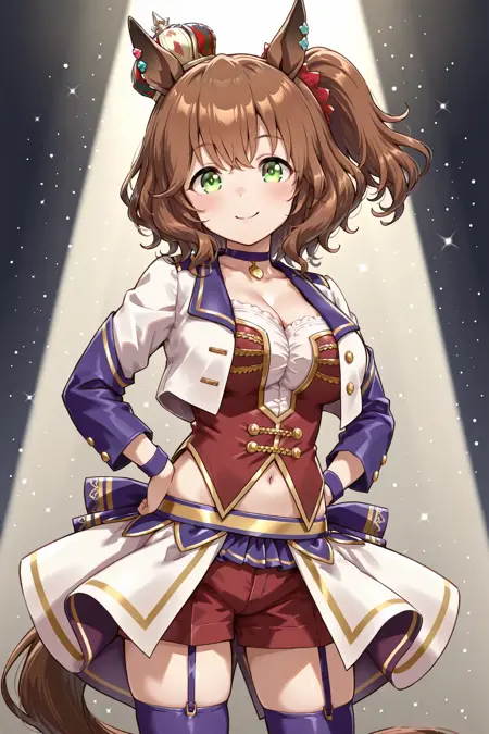 公式アレンジ衣装、チョーカー、長袖、リストバンド、短めのジャケット、白シャツ、白ジャケット、赤いベスト、お腹部分、ウエストキャップ、オーバースカート、赤いショートパンツ、短いショートパンツ、ガーターストラップ、紫の太ももハイ、白い靴履物、