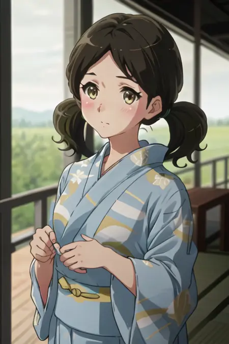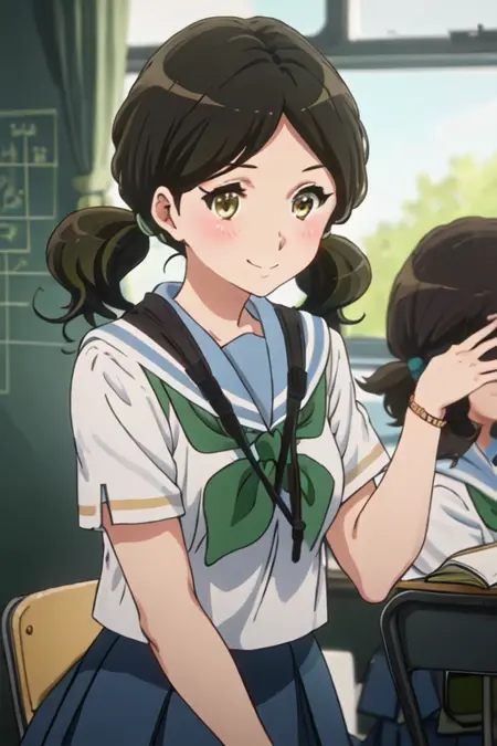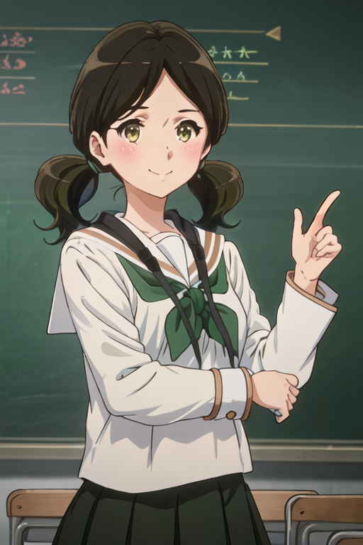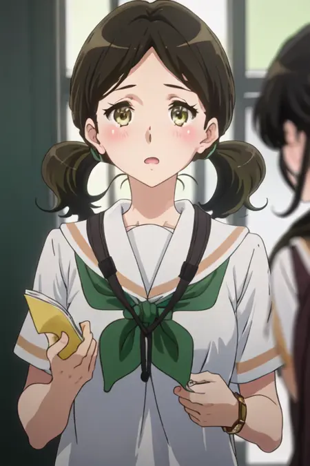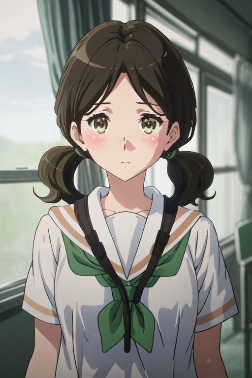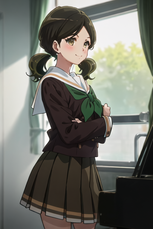 The trigger word is ogasawara_haruka_soundeuphonium, and the pruned tags are brown_hair, twintails, low_twintails, brown_eyes, black_hair, yellow_eyes. When some features (e.g. hair color) are not so stable at some times, you can add these them into your prompt.