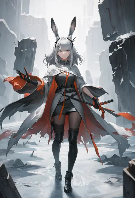 触发词为 frostnova_arknights,经过修剪的标签为 animal_ears, rabbit_ears, hair_ornament, long_hair, hairclip, scar_on_face, hair_over_one_eye, grey_eyes, grey_hair, white_hair, bangs。当某些特征(例如发色)有时不够稳定时,您可以将这些标签添加到提示词中。