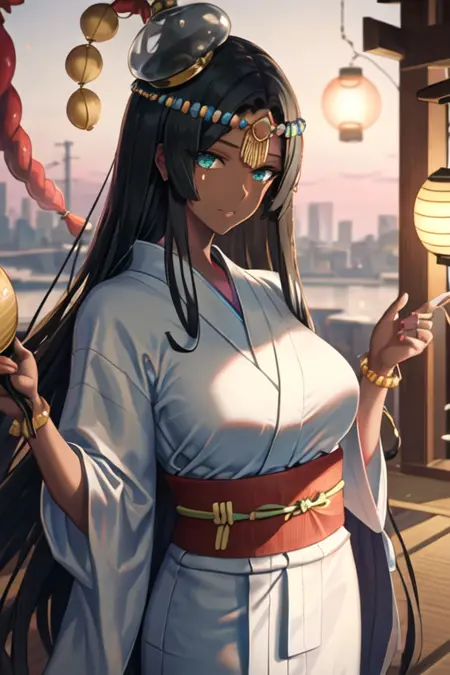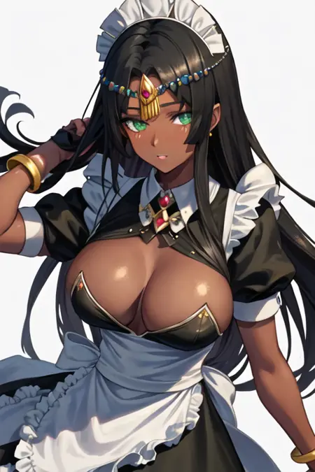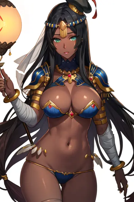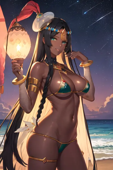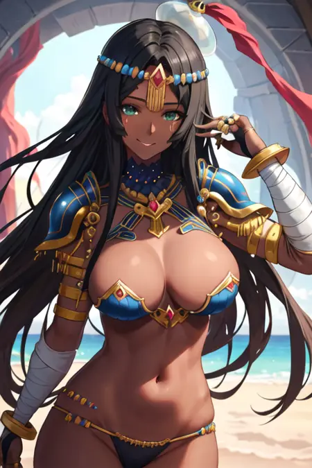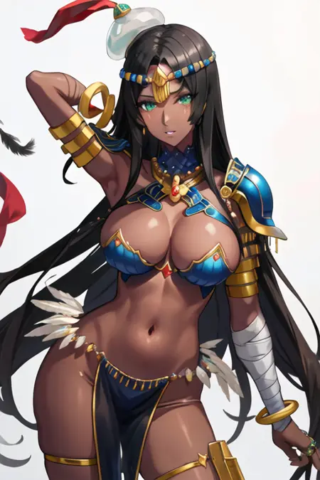 トリガー語はscheherazade_fgo、推奨タグはbest quality, masterpiece, highres, solo, {scheherazade_fgo:1.15}, long_hair, black_hair, dark-skinned_female, dark_skin, green_eyes, circlet, breasts, forehead_jewel, jewelry, large_breasts, hatです。