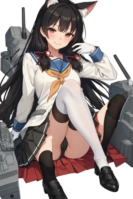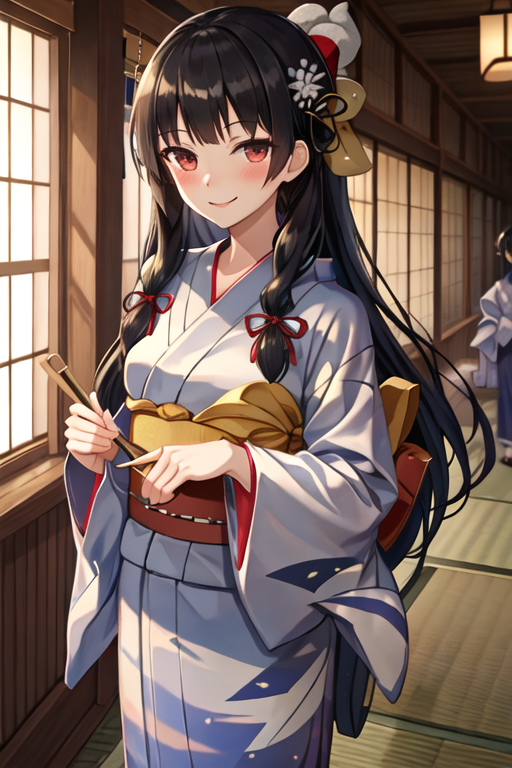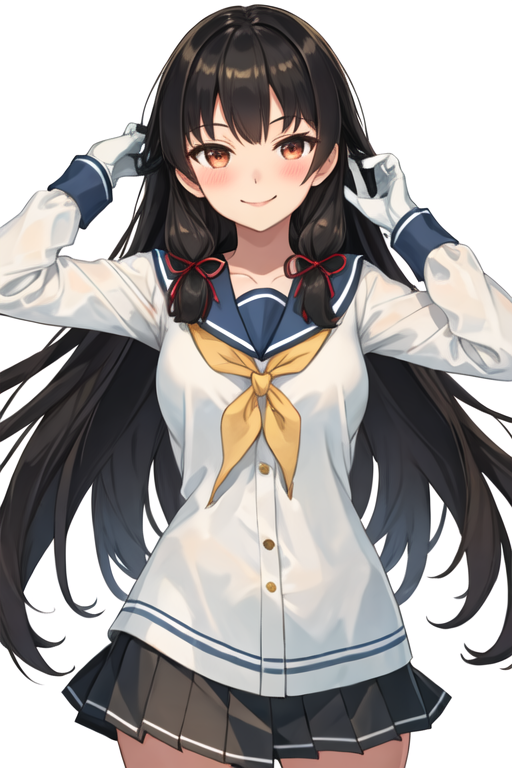 トリガー語はisokaze_kantaicollection、推奨タグはbest quality, masterpiece, highres, solo, {isokaze_kantaicollection:1.15}, black_hair, long_hair, red_eyes, ribbon, hair_ribbon, serafuku, tress_ribbon, smile, blushです。