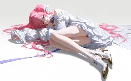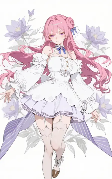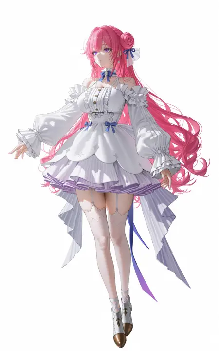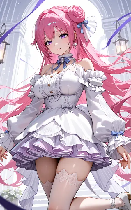 全身:dorothy \(nikke: the goddess of victory\),1girl,solo,bright pink long hair,braided hair bun on the top of the head,blue and white bow hair accessory,hair has luster,purple eyes,blue_bowtie,