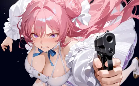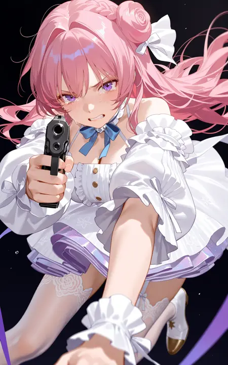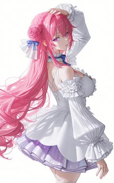 頭:dorothy \(nikke: the goddess of victory\),1girl,solo,bright pink long hair,braided hair bun on the top of the head,blue and white bow hair accessory,hair has luster,purple eyes,blue_bowtie,