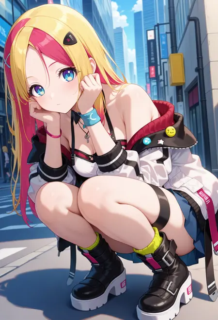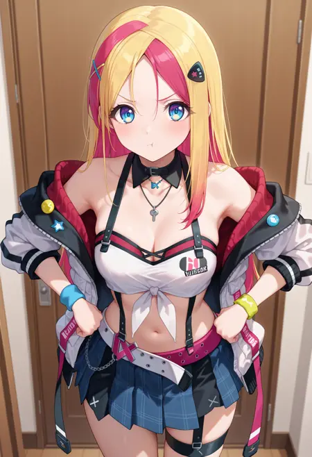 outfit1aasgr, long hair, multicolored hair, blonde hair, hair ornament, parted bangs, blue eyes, black choker, detached collar, necklace, bare shoulders, cleavage, crop top, white shirt, off shoulder, white jacket, wristband, belt, blue skirt, thigh strap
