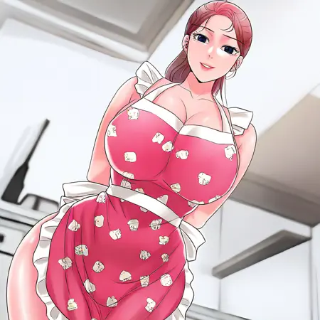 11. ((セクシーなテディプリントダークピンクの裸のエプロン、白いシルクベルト付き、フリル付き白い縁、))