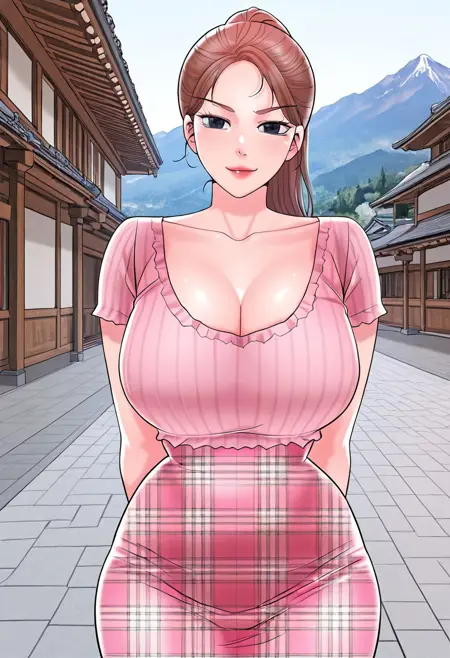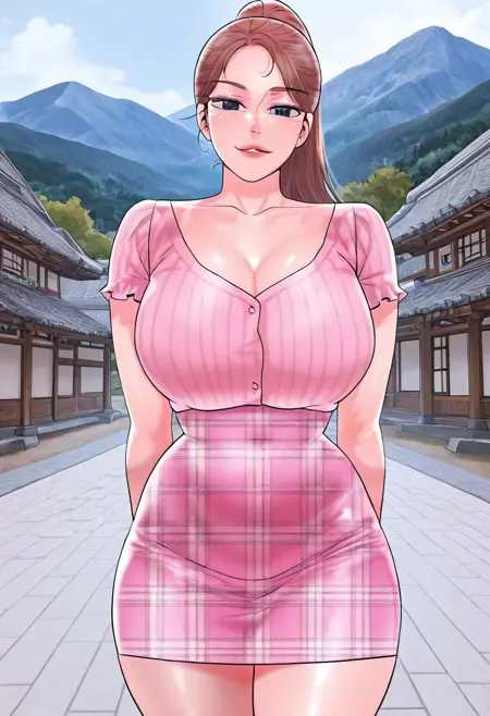 15. ((セクシーなショートスリーブカットアウトプリーツピンクシャツ、露骨な胸元、巨大な胸元、セクシーで美しいチェック柄ピンクペンシルスカート、)) ベージュパンティ、白いスポーツシューズ、