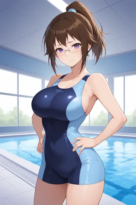 Add "two-tone swimsuit, shorts, blue wetsuit, sleeveless" for her swimsuit.