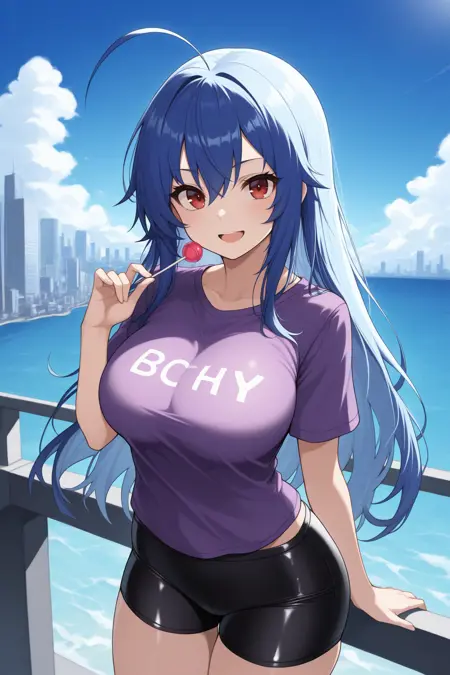 彼女の典型的な外見には、「ネックリボン、赤いリボン、濃い青のブレザー、胸元カットアウト、黄色のトリム、赤い腕章、薄い青のスカート、ミニスカート、プリーツスカート、青のスラックス」を追加してください。