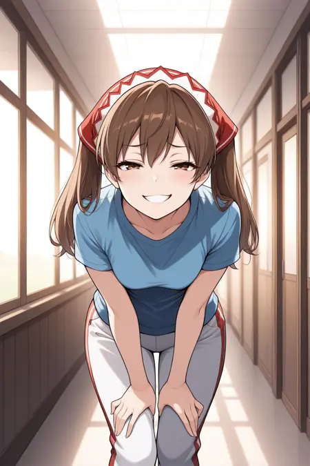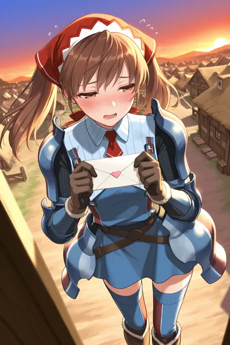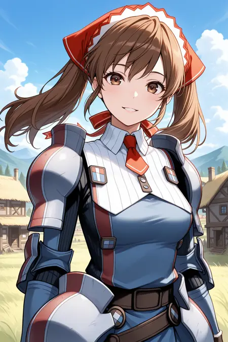 • 为她的典型造型添加 "红色头巾、蓝色装甲、条纹装甲、肩甲、翻领衬衫、条纹衬衫、红色领带、短领带、棕色手套、蓝色短裙、蓝色过膝袜、红色条纹过膝袜、棕色靴子"。