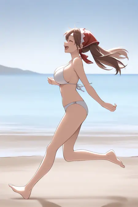 • 为她的泳装(笑)添加 "红色头巾、白色比基尼"。