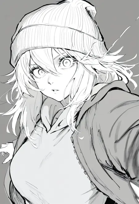 aW5va, monochrome, greyscale, traditional media, sketch, 1girl, solo, hatching \(texture\),