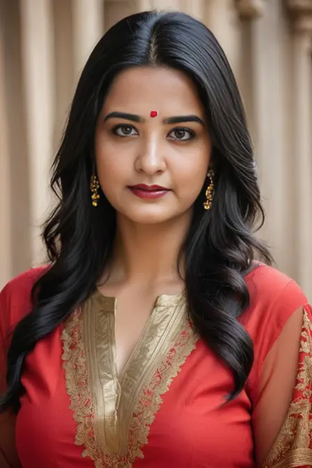 A beautiful Punjaban embodies qualities of attractiveness and associated with the culture, she characterized by expressive eyes, long hair, and a graceful demeanor, colorful traditional Punjabi suits (salwar kameez) or lehengas with intricate embroidery, perceived as confident and hospitable, carrying with elegance and reflecting the rich cultural heritage.