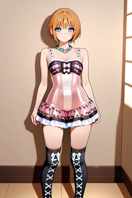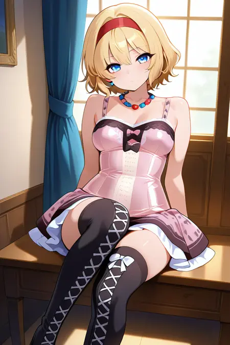 himegal_cos,pink dress,jewelry,necklace,cross-laced footwear,cross-laced thighhighs,black thighhighs,