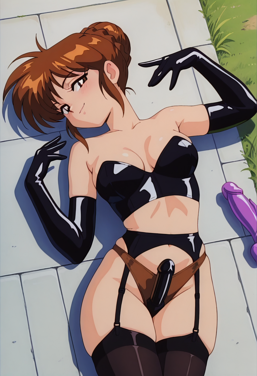 - ラテックス, ストラップレス, 胸, 胸元, 肩出し, 黒いブラ, 黒い肘まで手袋, 茶色のパンツ, サイバーデバイス, ディルド, ガーターベルト, 黒い丈長のタイツ,