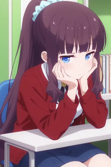 aahifumi, 파란 눈, 갈색 머리, 곧은 앞머리, 토끼꼬리, hifumic2, 파란 머리 스쿠니, 검은 목 리본, 흰색 셔츠, 빨간 카디건, 열린 카디건, 파란 치마,