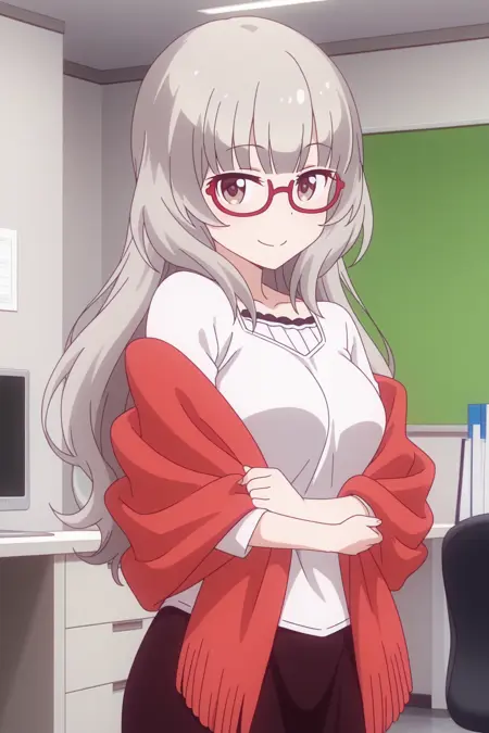 aashizuku, 갈색 눈, 회색 머리, 빨간 테안경, 언더림 안경, shizukuc1, 흰색 셔츠, 빨간 스카프, 갈색 치마, 긴 치마,