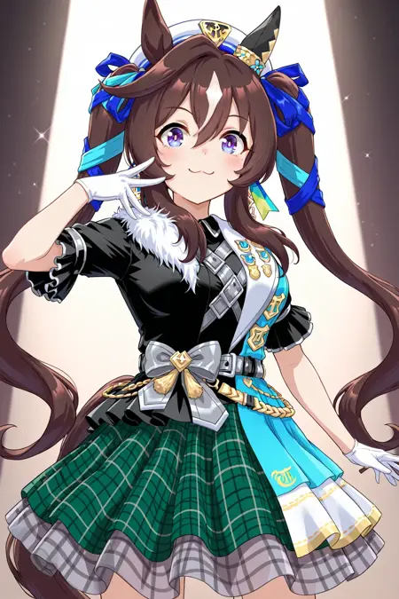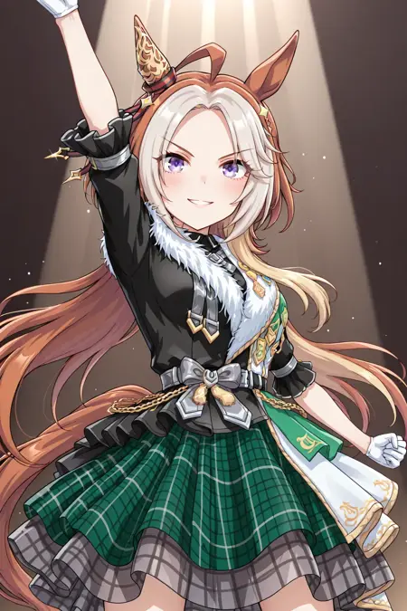 다채로운 셔츠, 자켓, 검정 자켓, 검정 셔츠, 브로치, 어깨 벨트, 모피, 녹색 체크 스커트, 허리 리본, 벨트, 흰 장갑, 회색 리본,