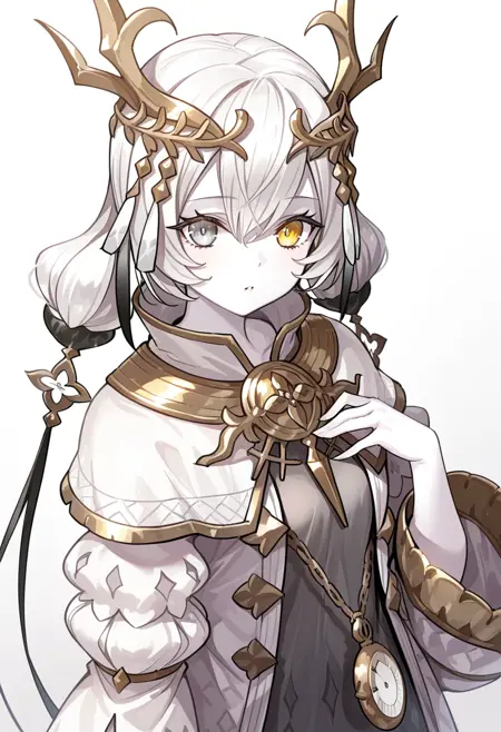 触发词-kara ideasu(莱扎),白发,短发,发饰,苍白皮肤,异色瞳,黄眼睛,灰眼睛,灰色连衣裙,白色外套,吊坠手表,腿部绷带,高跟鞋